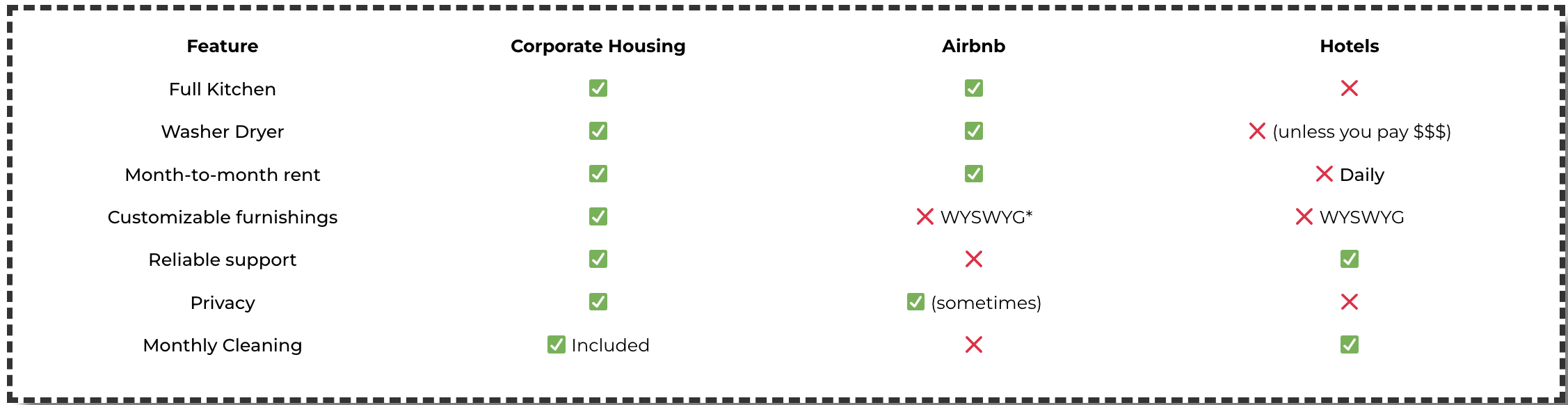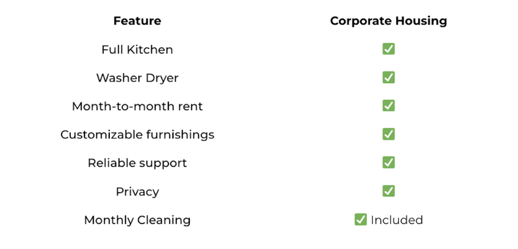 It’s a fully furnished rental, usually for 30+ days. The sweet spot between a hotel and an apartment lease. All your stuff is included—couch, bed, dishes, fast Wi-Fi, washer/dryer, even utilities.